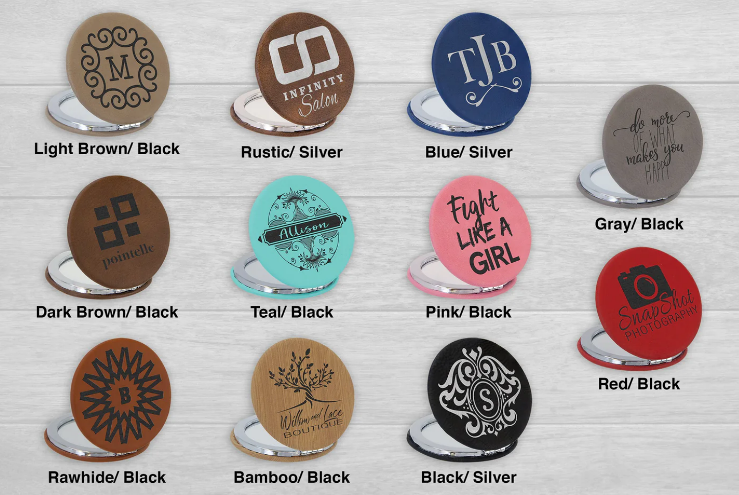 Check out our leatherette pocket mirrors, designed to provide the luxurious texture, appearance, and sensation of genuine leather while being incredibly affordable. Crafted from a water-resistant and durable material, these mirrors are perfect for everyday use as they are easy to clean and built to last.