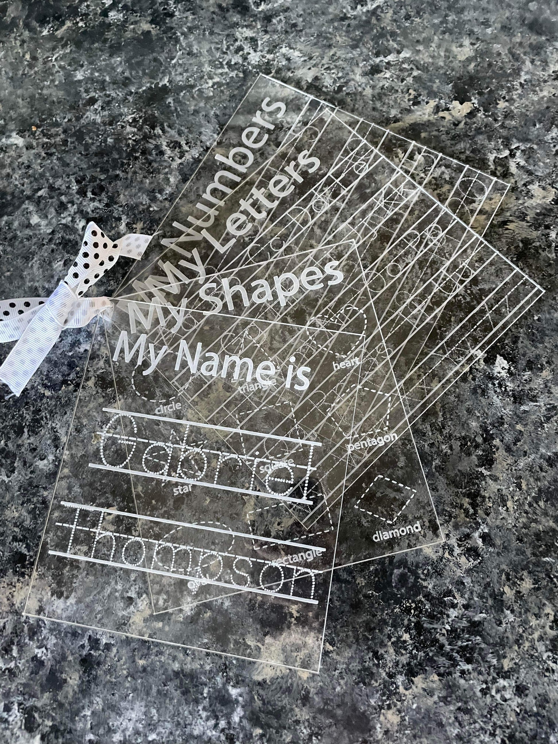 - Laser engraved on back of clear acrylic in dotted font easy to trace with a smooth front