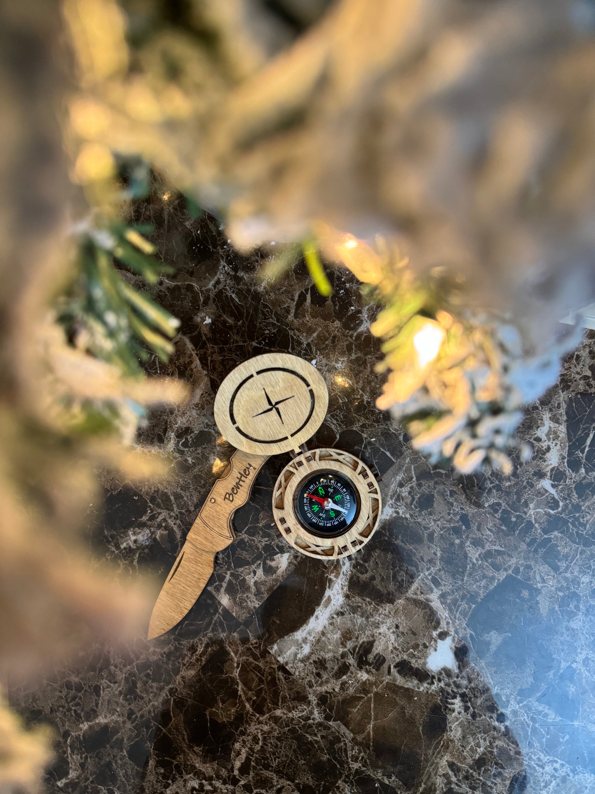 Unlock the world of imagination and learning with our collection of wooden toys. Crafted with love and care, these nature-inspired toys bring joy and education together in perfect harmony. Our custom-made compass holder and push button pocket knife is the perfect companion for little explorers, encouraging them to venture into the great outdoors with confidence. Give the gift of imagination and adventure with our product today!